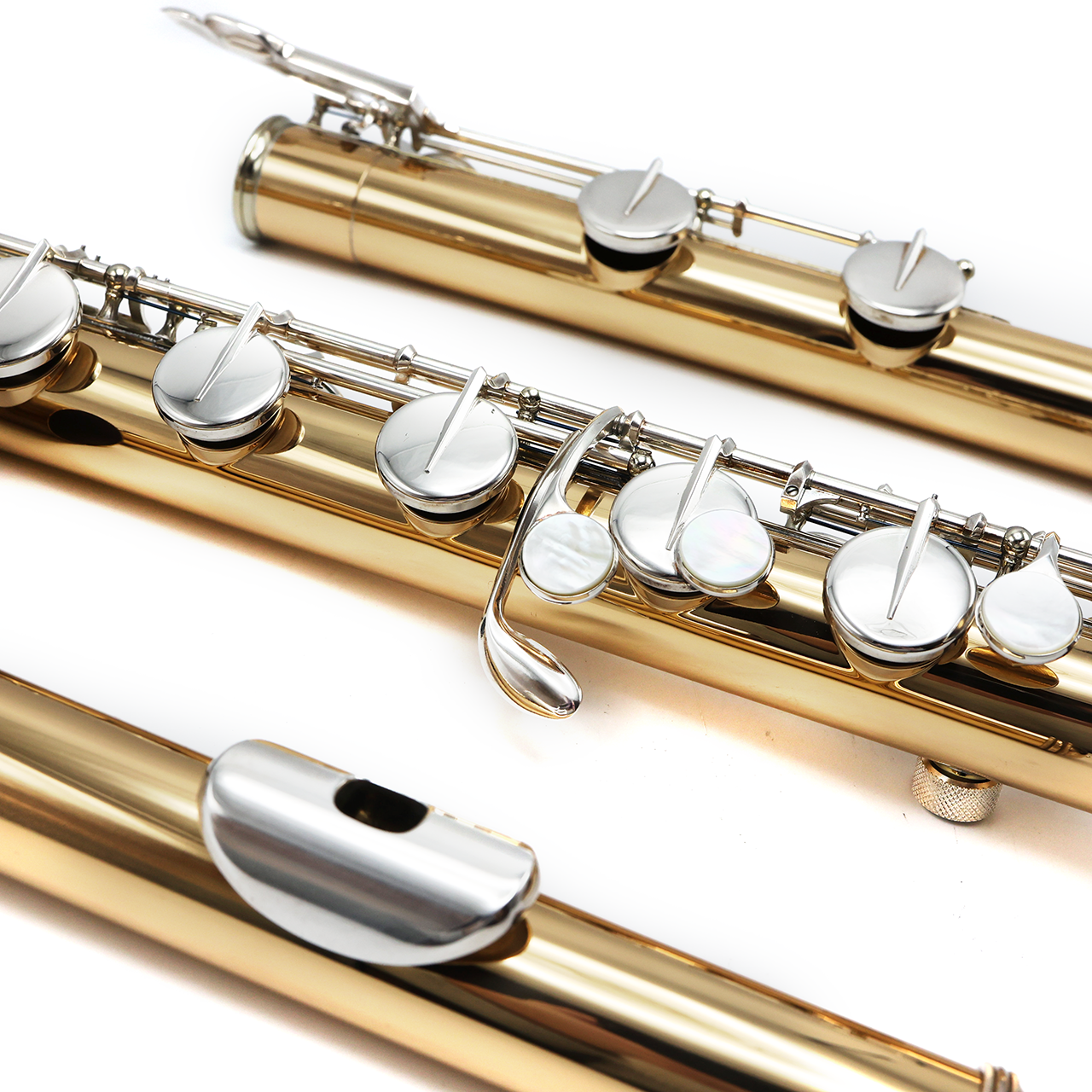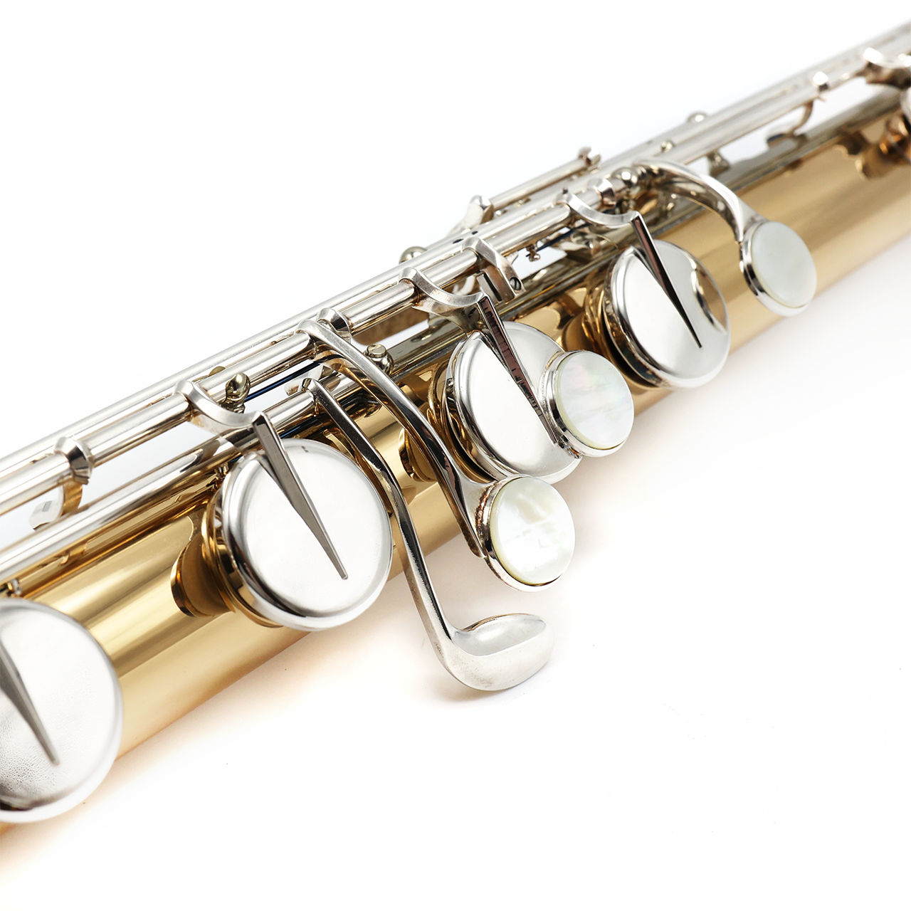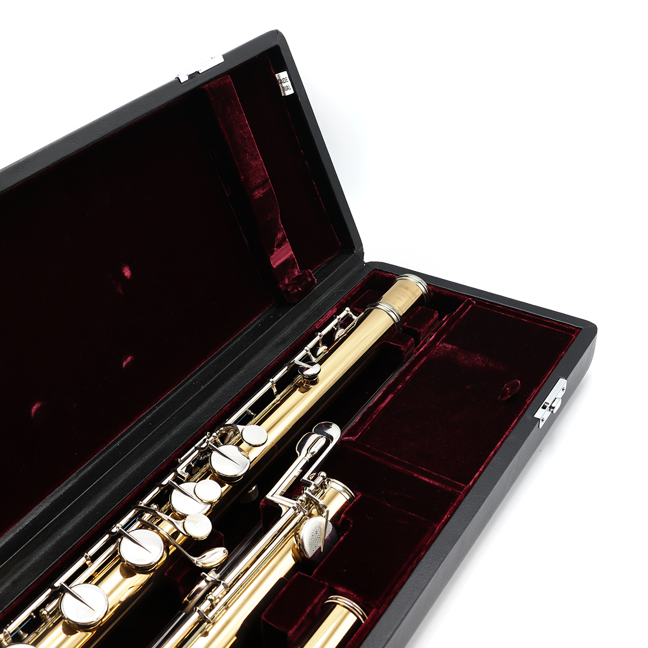 - Gold-brass alloy headjoint with silver lip plate and riser