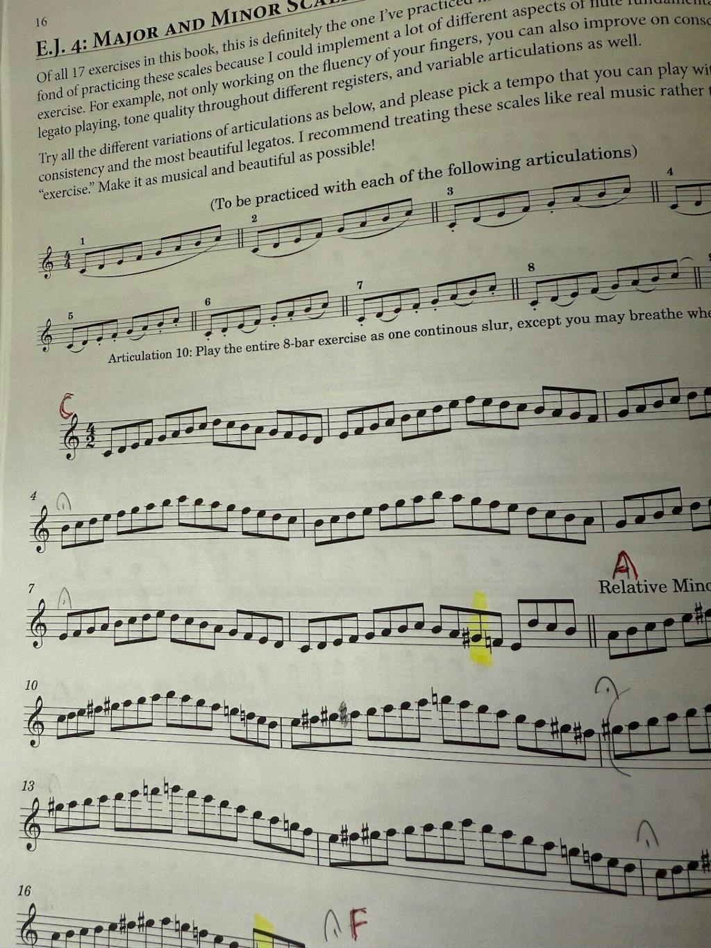 • Shows Ms. Choi’s markings and wisdom gathered from an array of her former teachers including Julius Baker and Jeffrey Khaner.