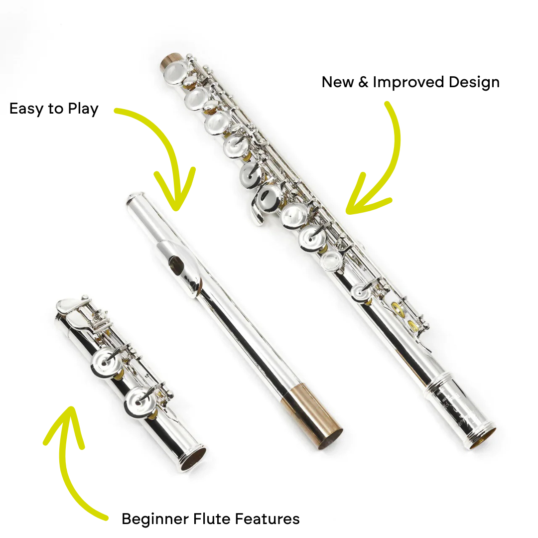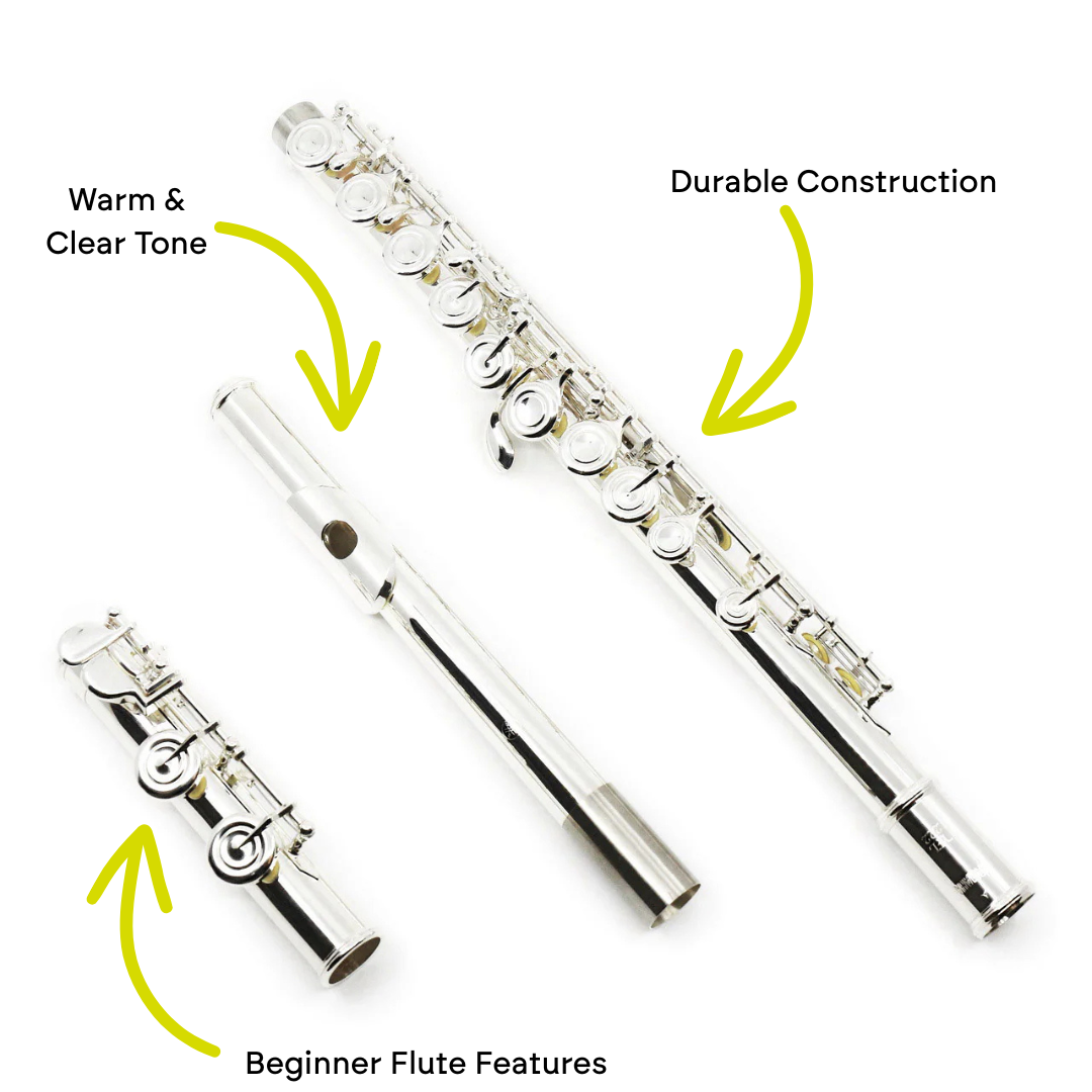 Beginner flutes typically come with closed hole keys, a C footjoint, and are usually all silver-plated. Step-up flutes typically come with open hole keys, a low B footjoint, and may be partially made of solid silver (for example, a step-up flute might have a solid silver lip plate). Some beginner players choose to start with a step-up flute to avoid having to upgrade in the first few years.