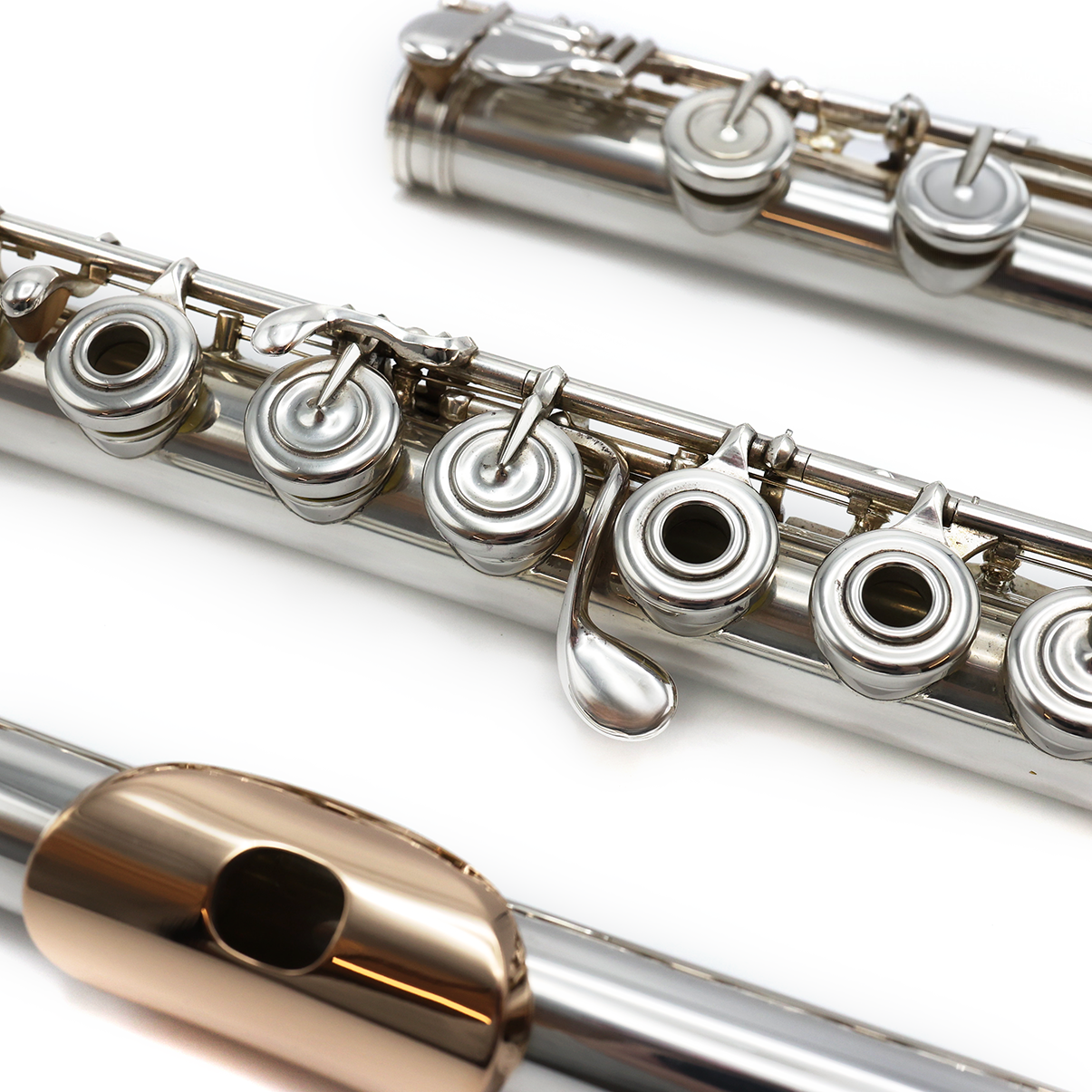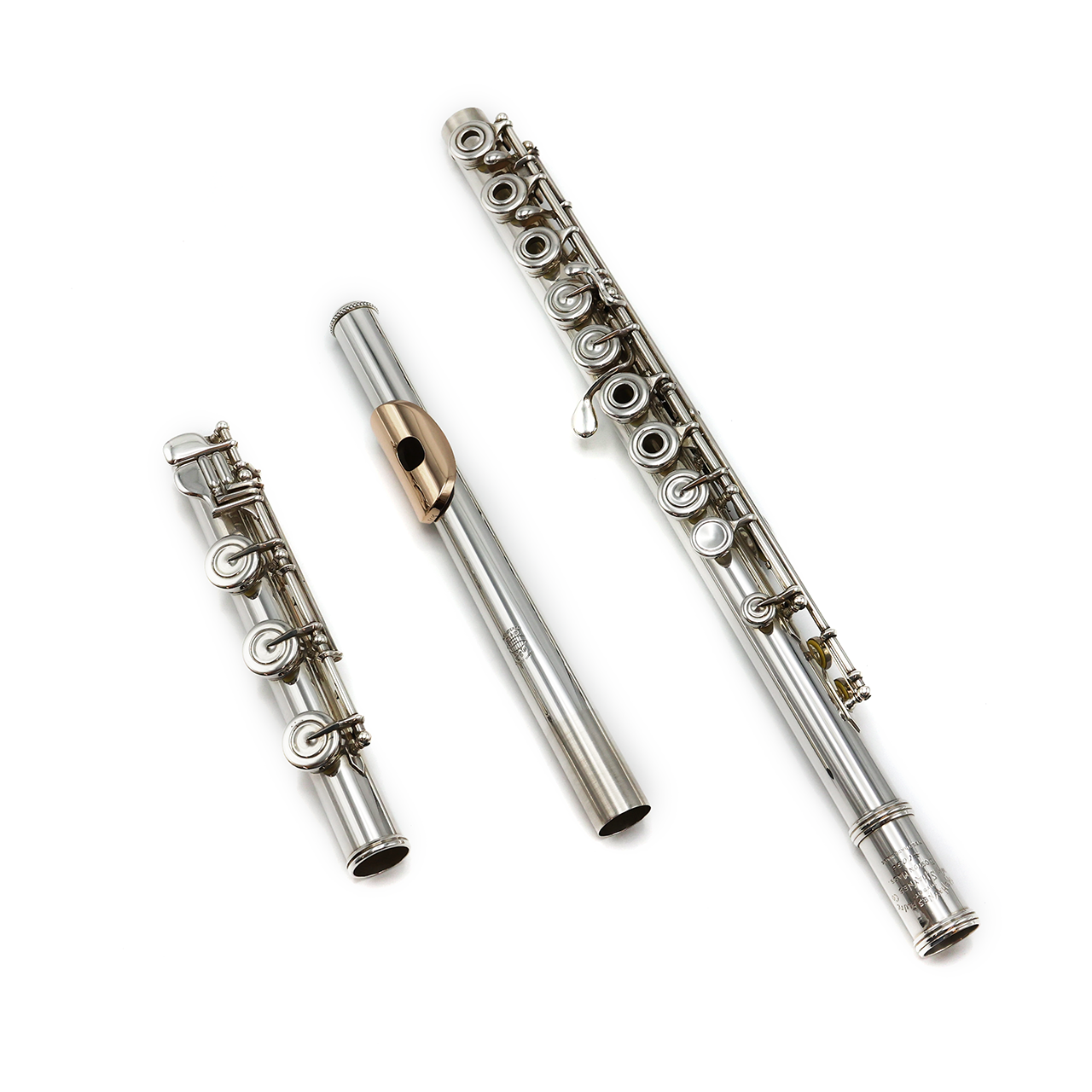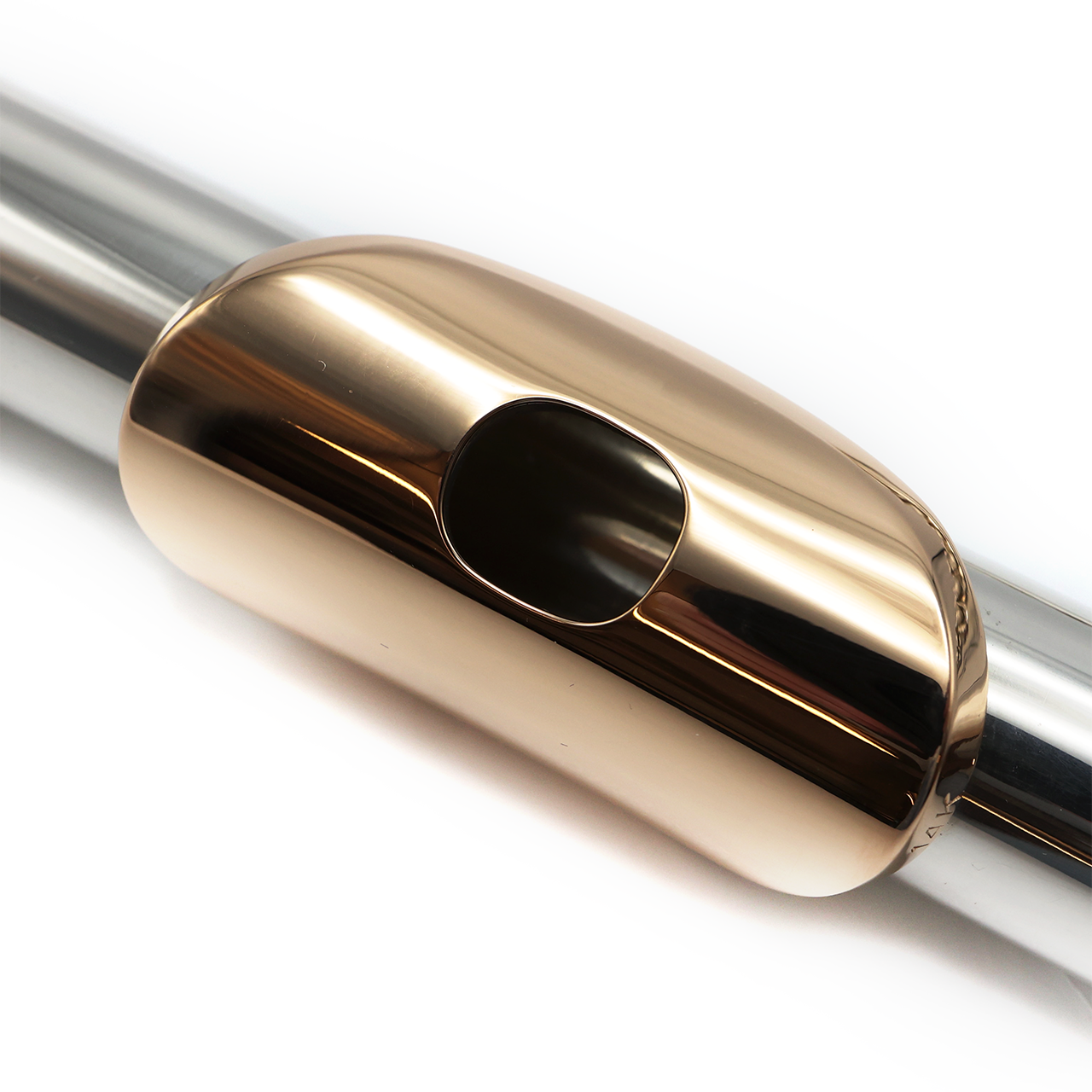 - Coin silver (.900) hand-cut headjoint with 14K gold lip plate and riser