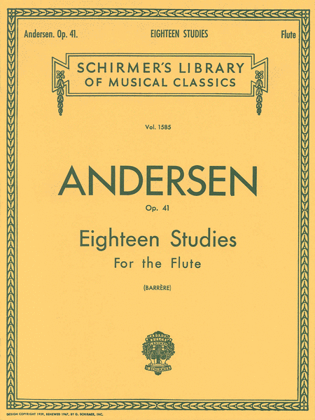 18 Studies for Flute, Op. 41 (Studies and Etudes) by Joachim Anderson (1847-1909), Published by G. Schirmer (Hal Leonard), Edited by Georges Barrere, Includes flute part only.