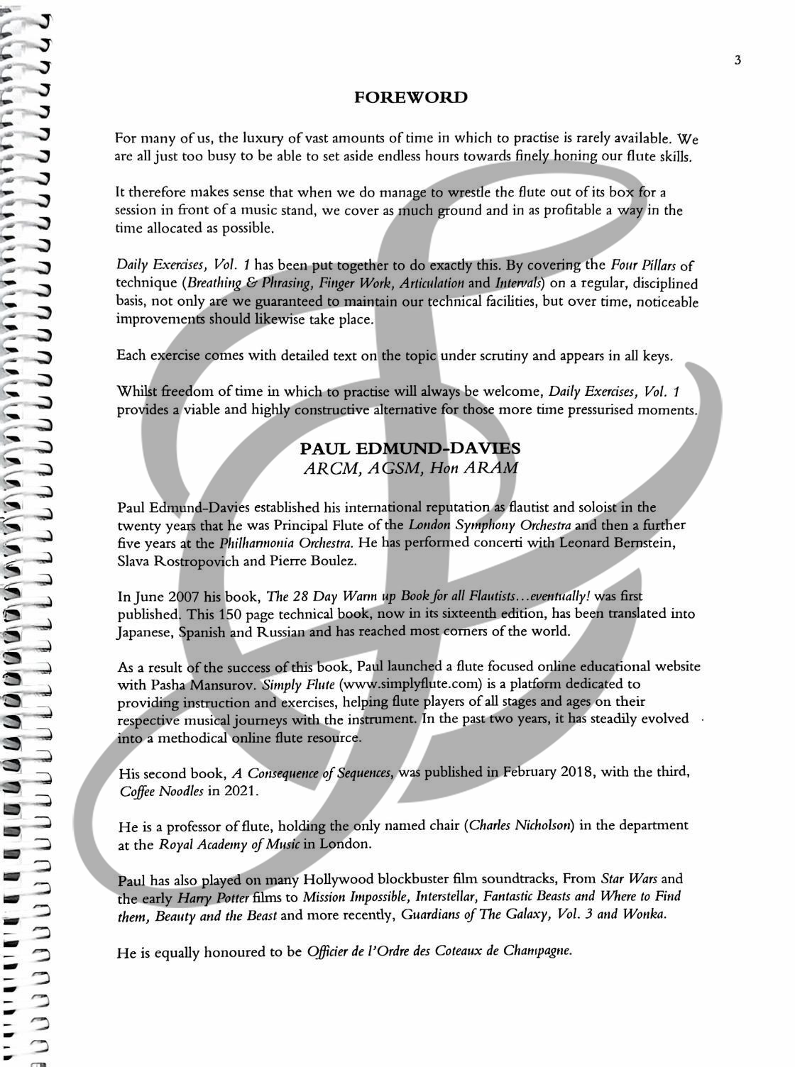 Paul Edmund-Davies established his international reputation as flautist and soloist in the twenty years that he was Principal Flute of the London Symphony Orchestra and then a further five years at the Philharmonia Orchestra. He has performed concerti with Leonard Bernstein, Slava Rostropovich and Pierre Boulez. In June 2007 his book, The 28 Day Warm up Book for all Flautists...eventually! was first published. This 150 page technical book, now in its sixteenth edition, has been translated into Japanese, Spanish and Russian and has reached most corners of the world. As a result of the success of this book, Paul launched a flute focused online educational website with Pasha Mansurov. Simply Flute (www.simplyflute.com) is a platform dedicated to providing instruction and exercises, helping flute players of all stages and ages on their respective musical journeys with the instrument. In the past two years, it has steadily evolved into a methodical online flute resource. His second book, A Consequence of Sequences, was published in February 2018, with the third, Coffee Noodles in 2021. He is a professor of flute, holding the only named chair (Charles Nicholson) in the department at the Royal Academy of Music in London. Paul has also played on many Hollywood blockbuster film soundtracks, From Star Wars and the early Harry Potter films to Mission Impossible, Interstellar, Fantastic Beasts and Where to Find them, Beauty and the Beast and more recently, Guardians of The Galaxy, Vol. 3 and Wonka. He is equally honoured to be Officier de l’Ordre des Coteaux de Champagne.