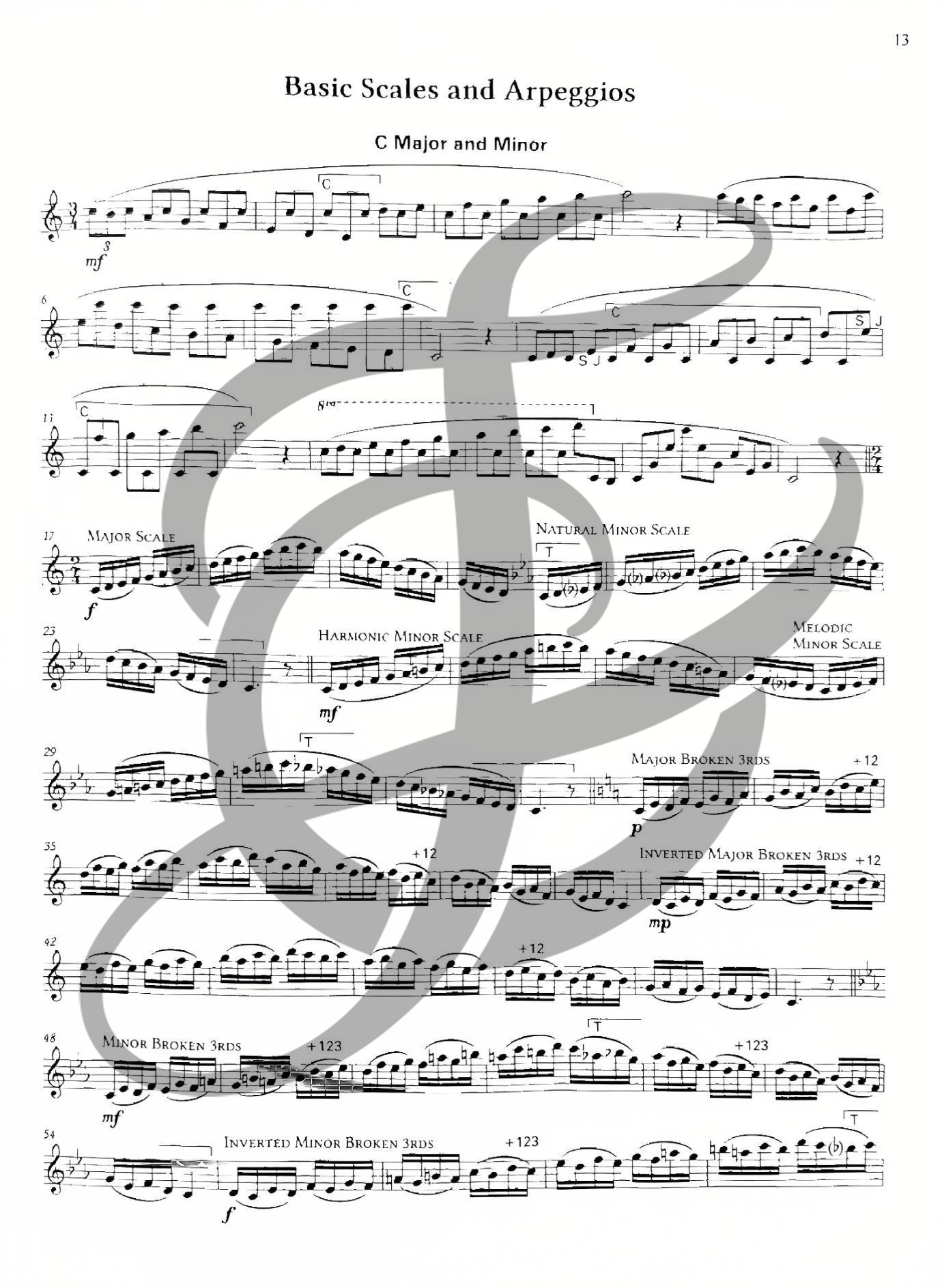 Explicit notation of wide-ranging articulations and dynamics in the "Basic Scales and Arpeggios" section.