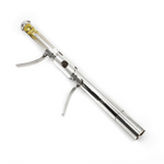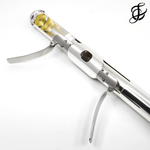 The first prototype was made by Eva Kingma in 1992. It was based on the idea that the slide would go into the flute, making upwards glissandi from the normal fingerings. There was a rubber band to pull the head back to its home position. Not so great for the jaw, teeth and neck. Like many “failures” early in the development of an idea, this prototype was not a failure, because it taught the valuable lesson that the headjoint had to slide outwards, to lengthen the flute, not shorten it.