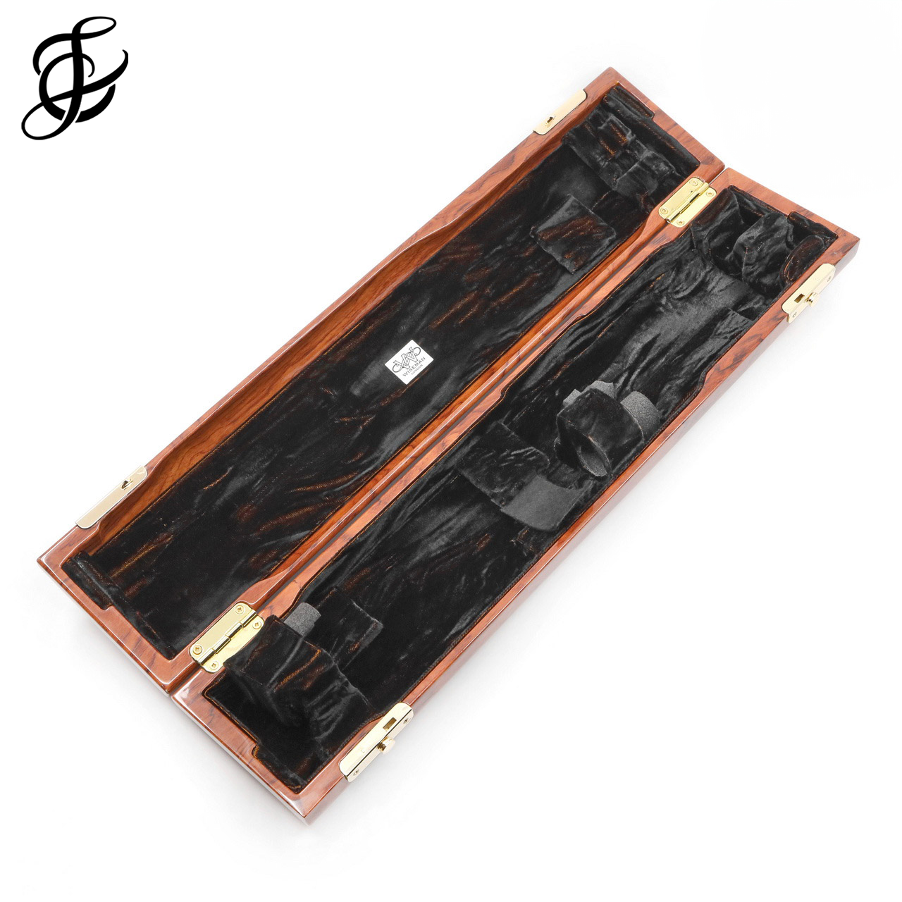 The inside has been re-designed completely to remove any pressure on keywork, and to provide shock-absorbing suspension for each joint in all directions. Velvet-covered shock-absorbing rubber blocks have replaced all traditional wooden blocking, and the joints are no longer allowed to directly touch the floor and ends of the case. The joints are held so firmly, that the joints still hold firm if the case is accidentally opened up-side-down.