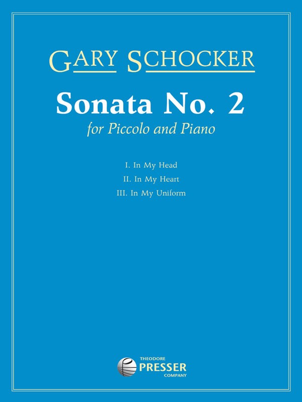 For Piccolo and Piano, Following the widespread popularity of his first piccolo sonata, Gary Schocker has given piccoloists Sonata No. 2, also premiered at the NFA’s annual convention by Zart Dombourian-Eby. Bringing a poetically evocative set of titles to the A-B-A sonata movement structure, with hints of military band flavor in the finale, Schocker offers the movements In My Head, In My Heart, and In My Uniform. For advanced performers. Dur.: 10’30"