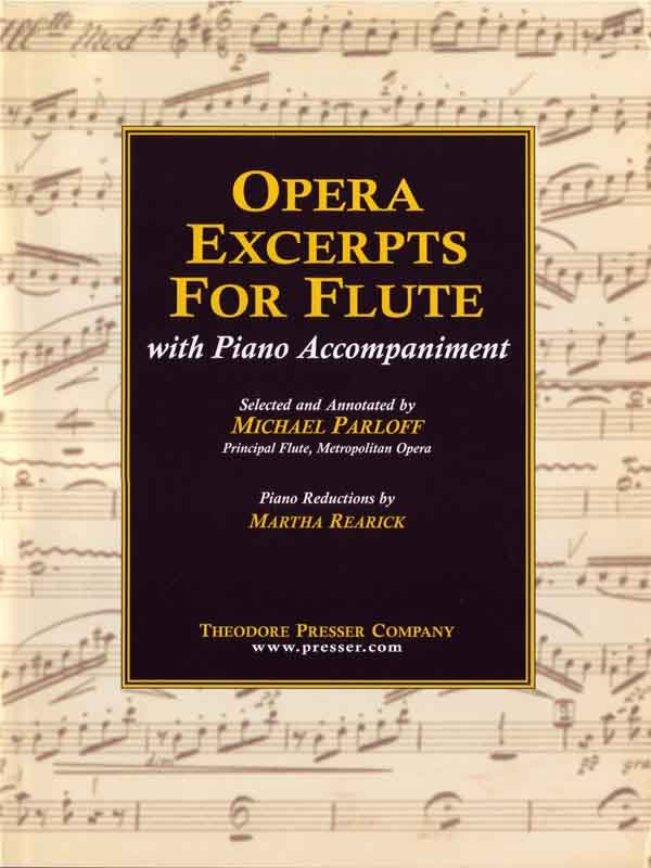 Opera Excerpts for Flute with Piano Accompaniment (Reference Work, Studies/Etudes, Orchestral Excerpts), Published by Theodore Presser (Carl Fischer), Edited by Michael Parloff with Piano Reductions by Martha Rearick, Includes flute book (84 pages) and piano score book (111 pages). Written in 2000.