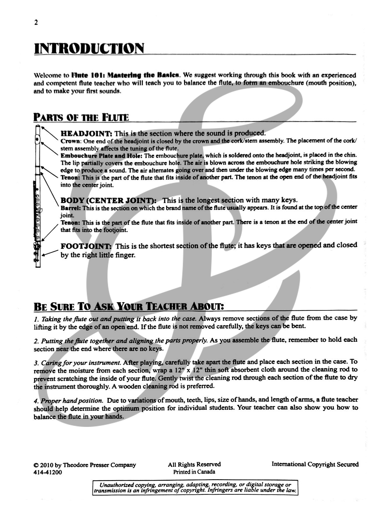 Flute 101: Mastering the Basics is a uniquely comprehensive teaching resource which, in one book, takes the student through introductory beginner, and intermediate curriculum. This book reinforces that beginners not only deserve an organized and creative curriculum, but also have a variety of learning styles that need to be addressed creatively, and that learning the fundamentals can be enjoyable when players can experience their benefits. Includes both a Teacher’s Guide with a wealth of information and innovative teaching ideas, and a Phrasing Guide, which presents an organized curriculum to explore musical phrasing. The innovative lesson plans present, in a clear and logical sequence, songs, duets, and creative activities to develop tone, technique, and musicianship. The pioneering set of teaching and phrasing guides make Flute 101: Mastering the Basics a must-have staple of the flute teaching studio. For teachers with beginning to intermediate flutists.