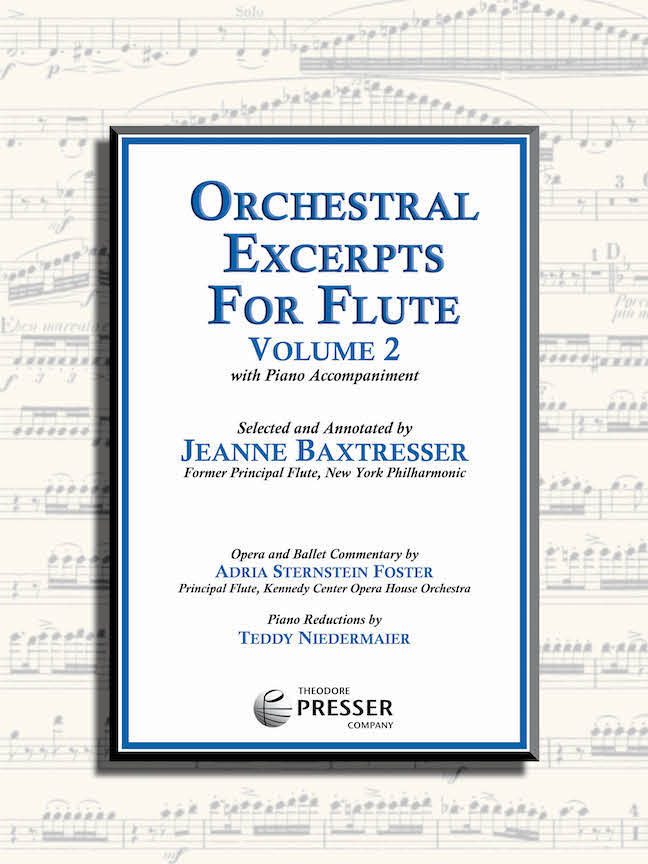 Orchestral Excerpts for Flute, Volume 2 - (Reference Work, Studies/Etudes, Orchestral Excerpts) by Jeanne Baxtresser (b. 1947), Published by Theodore Presser, Includes flute part and piano accompaniment book. Published in 2019.