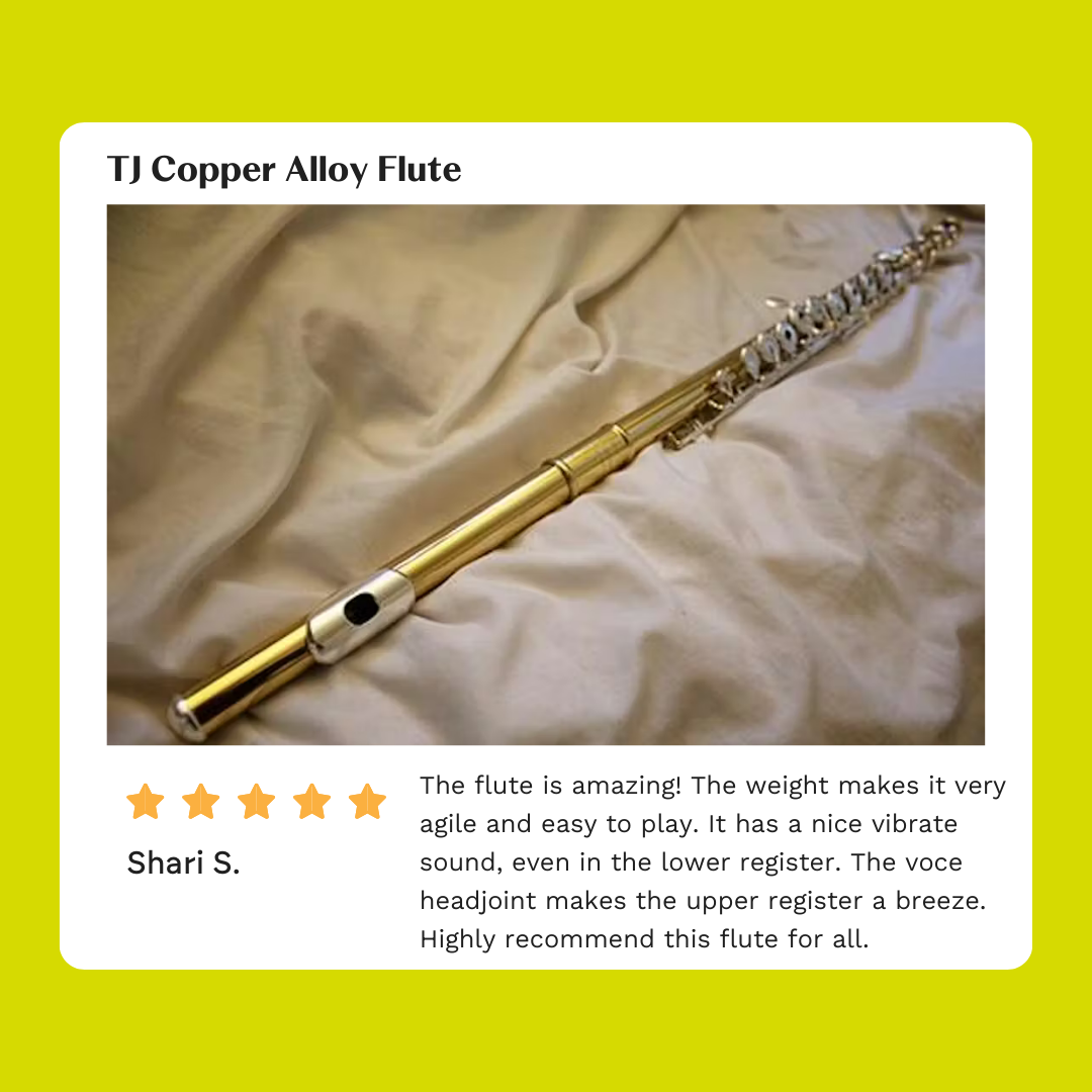 Omg! I love my new TJ copper Alloy Flute, i’m only an amateur flute player. I started out playing flute in 1965 and by 1971. I changed over to French Horn so I’m actually a French Horn player but I have never stopped playing my flute. In 2014 I met someone and got into a Flute group just for fun and ensemble and she worked at a music store and I ended up buying a pearl flute. I started taking flute lessons again. I really love the flute and played it for years. I had a Horse Cart accident last year and hurt my shoulder and it’s been bothering me after I play a while so I heard about the copper alloy Flute being a lot lighter , so I thought I would try from the Flute center through my Flute Teacher and I loved it. The only thing I had to change my lip placement to be in tune, but the sound is amazing that comes out of the flute and I’m starting to play it beautifully without blowing hard, my Flute Teacher always laughed at me because she plays in the band and orchestra with me that I played like a Horn player . A now I play in tune all the time with a beautiful tone . I am really enjoying playing my new copper alloy flute. I recommend it for anyone that is thinking of getting into further playing in high school and on. I’m only an amateur but I really enjoy playing my flute besides my French Horn that I play in several bands and orchestras thank you Flute center. Pam