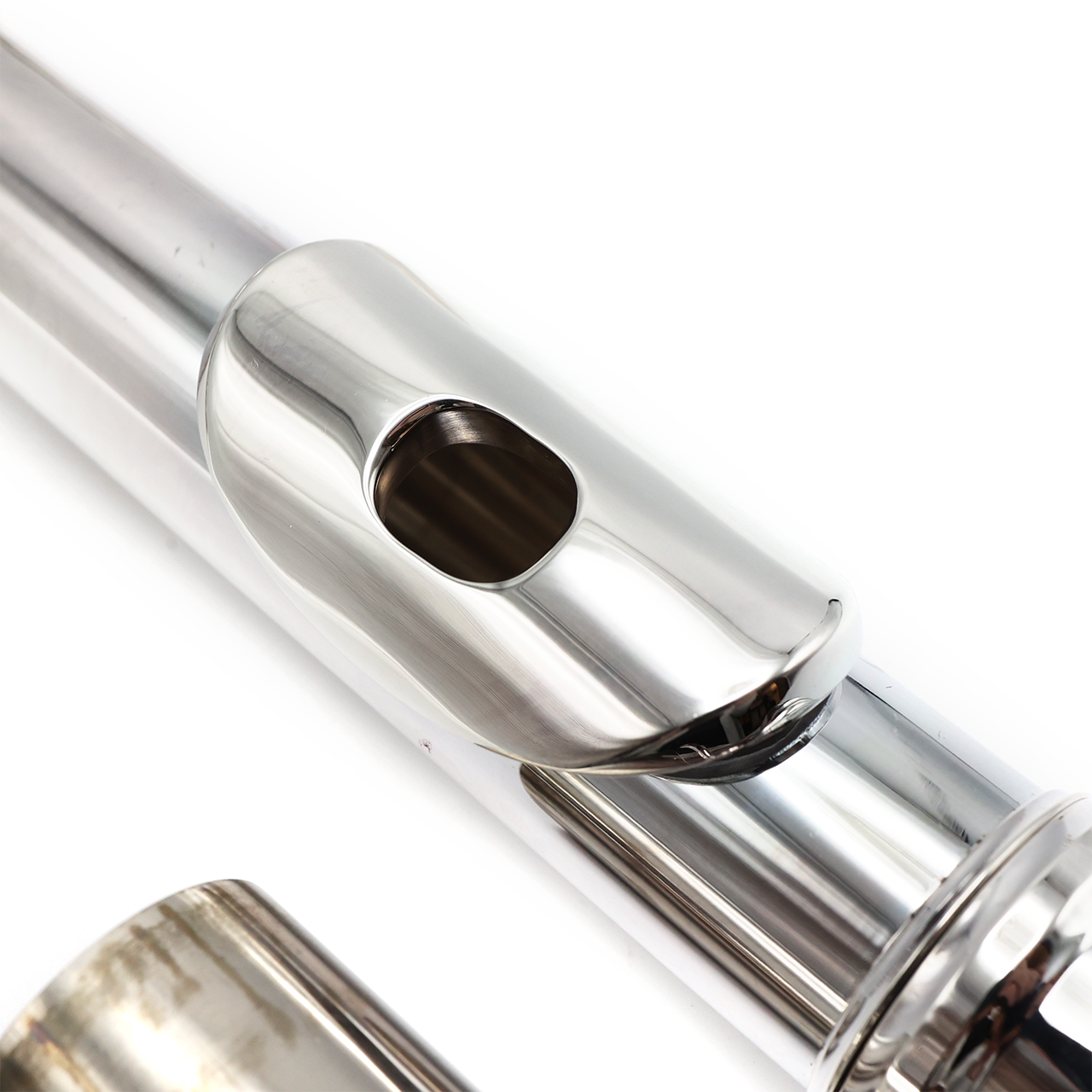 - Silver-plated curved headjoint with sterling silver lip plate and riser